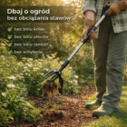 Po zamocowaniu na trzonku pracujesz w pozycji stojącej, bez ciągłego schylania się do ziemi. Podpora na stopę pozwala łatwo wbić narzędzie nawet w twardszą glebę.